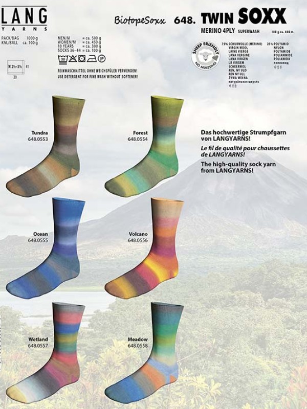 Zachte merinowol in een mooi lang kleurverloop. De kleuren komen overeen met de kleuren in de natuur van de biotopen oceaan, vulkaan, bos, weide, moeras en toendra. En heel praktisch met een scheidingsdraad in het midden van de bol, zodat je twee identieke sokken kan breien.