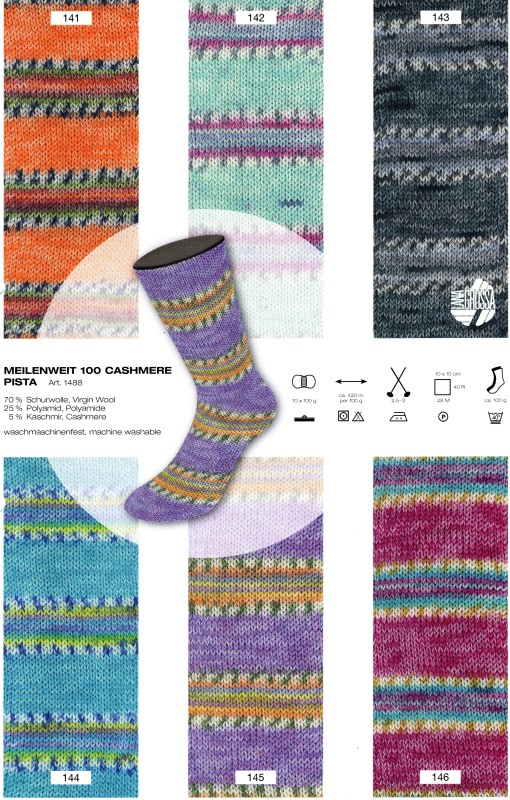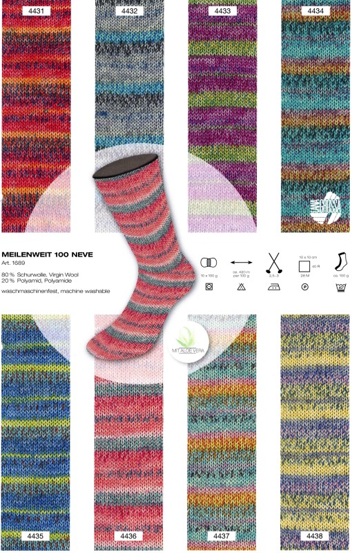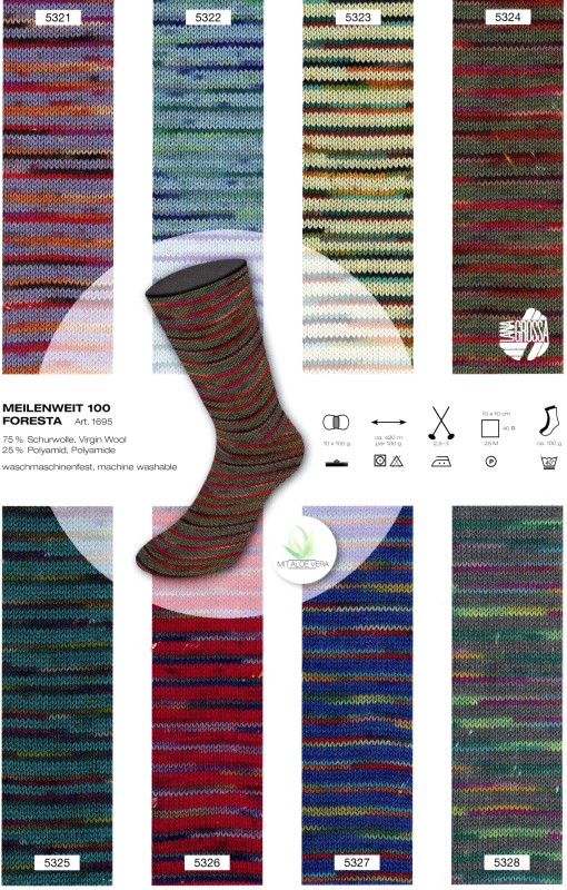 Kleurrijke strepen in een rustige achtergrond geven een sprekende sok. Dit garen is geïmpregneerd met Aloë Vera voor extra zachtheid bij het breien en dragen.
